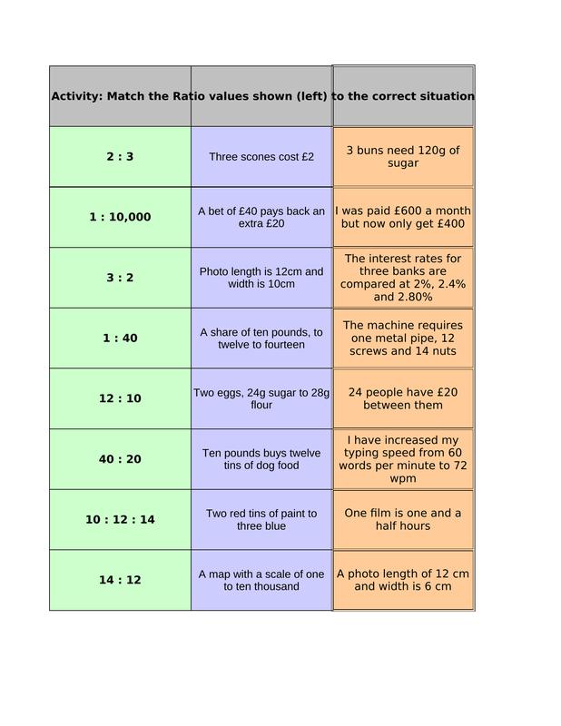 Activity: Match the Ratios on the left (green) with the situations on the right, first the blue column, then try the orange.