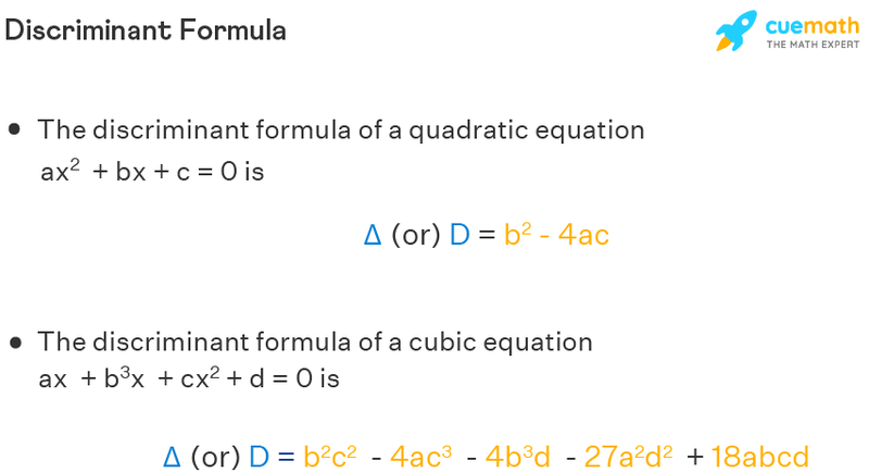 The discriminant in math is defined for polynomials and it is a function of coefficients of polynomials. The discriminant of quadratic equation ax^2+bx+c = 0 is b^2 - 4ac and it is denoted by D or Δ.