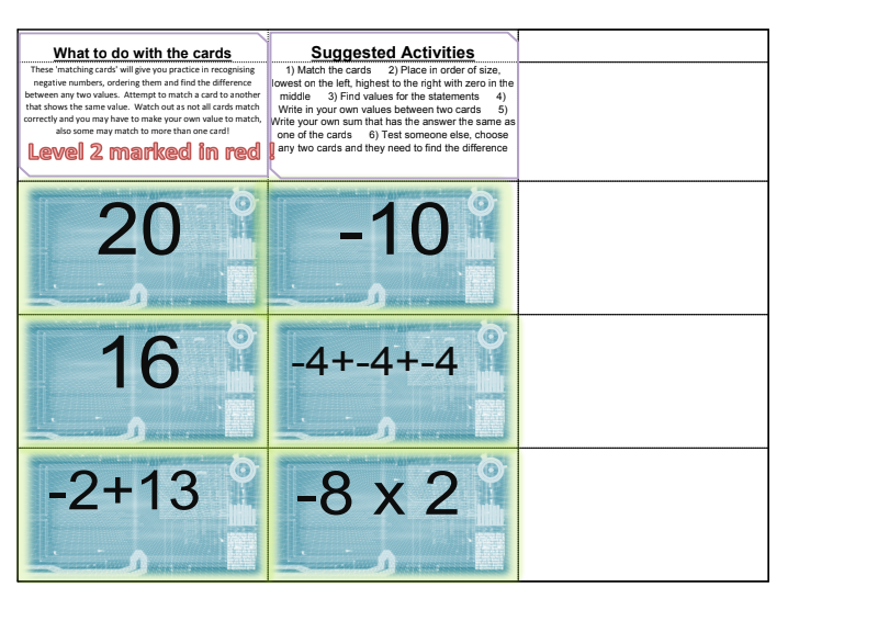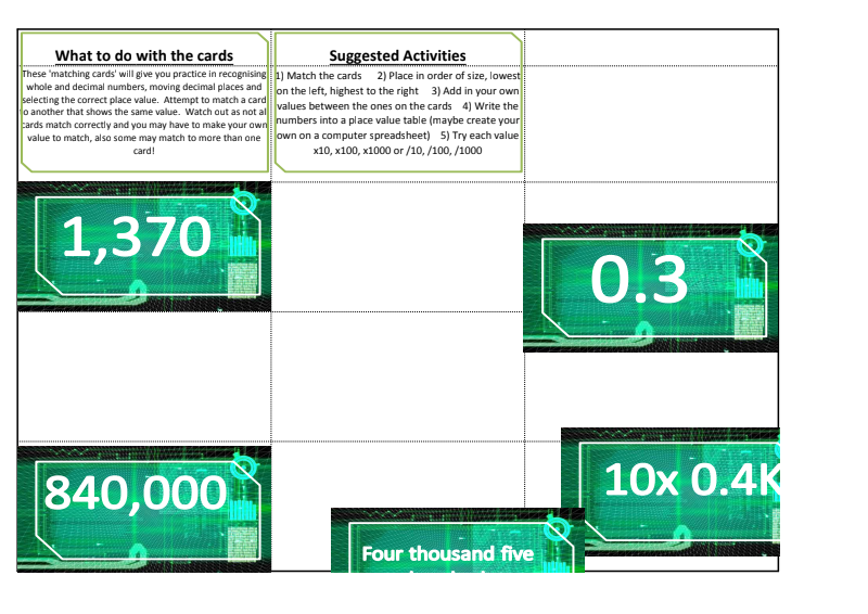 Activity: Ask the tutor for the Level 1 Large number Matching Cards. Use to match different representations of numbers a) match b) sort / order c) find the difference between any two cards