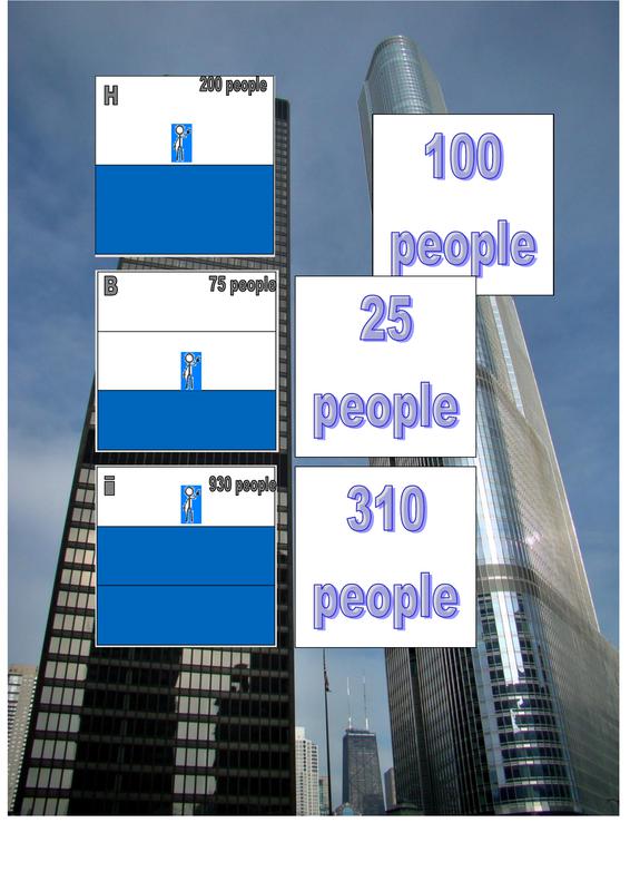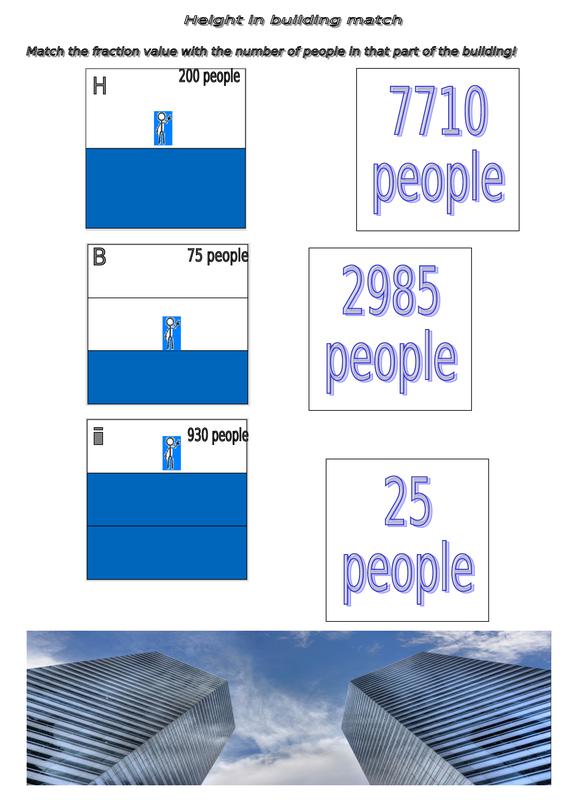 Activity: Fraction Building. Finding fractions of values. Instructions: match the cards.. The fractions on the left show a height through a building with the top right number of people being its max. Count the number of pieces through the building and divide then multiply to find the number of people UP TO that fraction of the building.