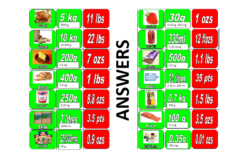 ACTIVITY: Match the correct Metric (green) card to the items. Q) can you convert the measurement eg KG to g to help to sort/order the items heaviest to lightest /most liquid to least...