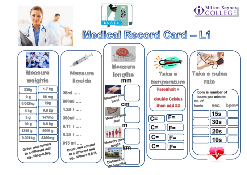 ACTIVITY: Can you fill in this Nursing Medical Record Form Level 1 by sorting/ordering the measurements......convert as shown....take measurements as shown