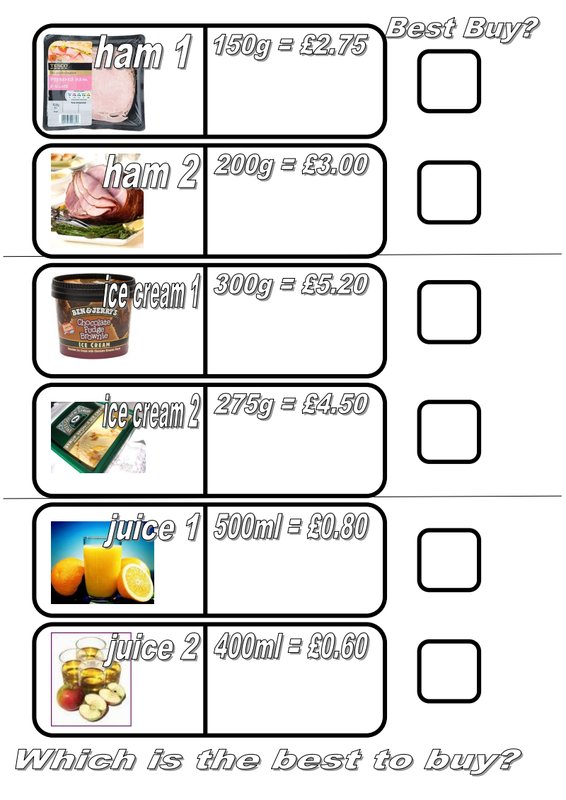 Best Buy Ratios. ACTIVITY:... Can you find which is the best ham, ice cream and juice to buy using the information and ratios?
