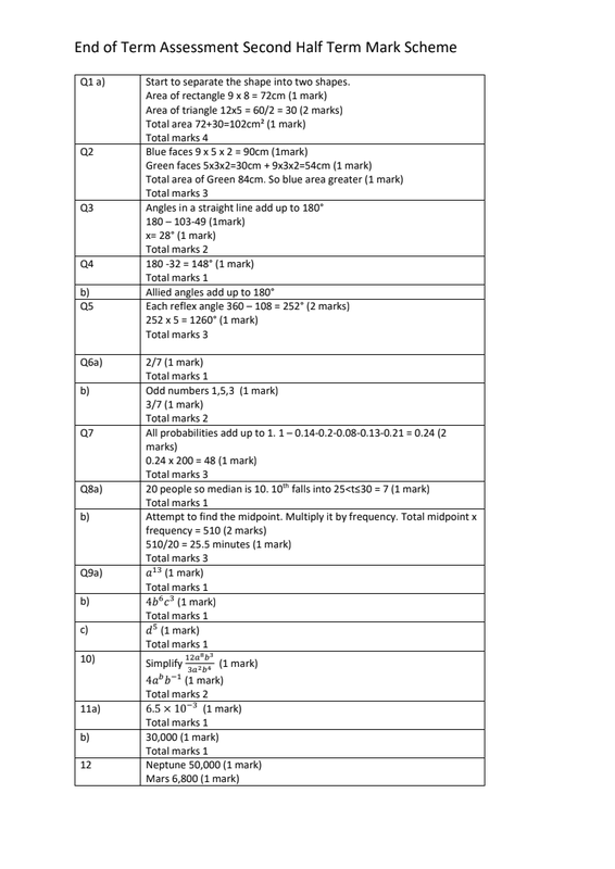End Of Term Asessement Half Term 2 Mark Scheme